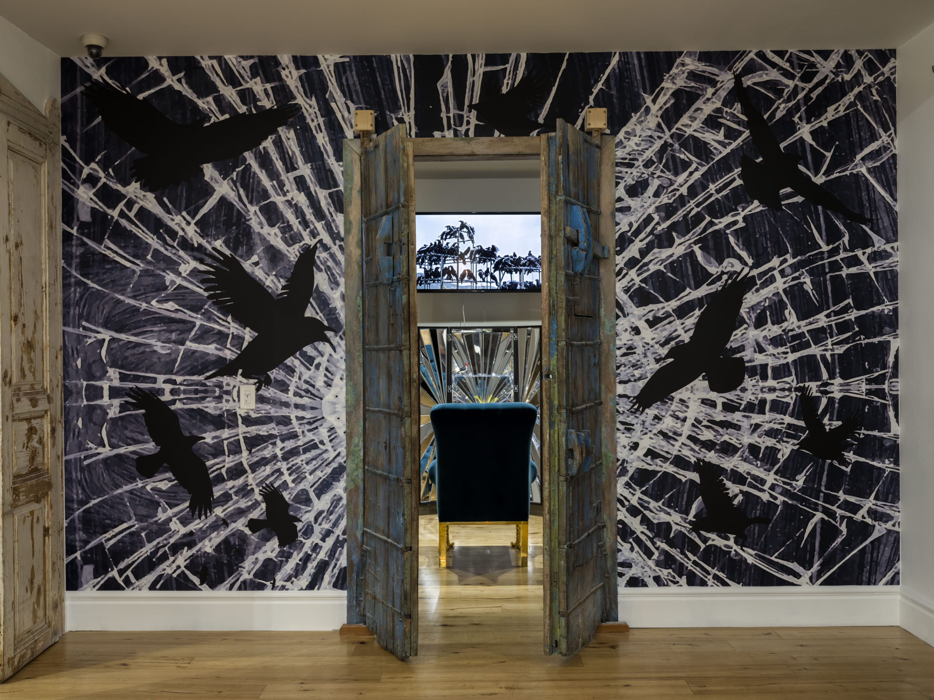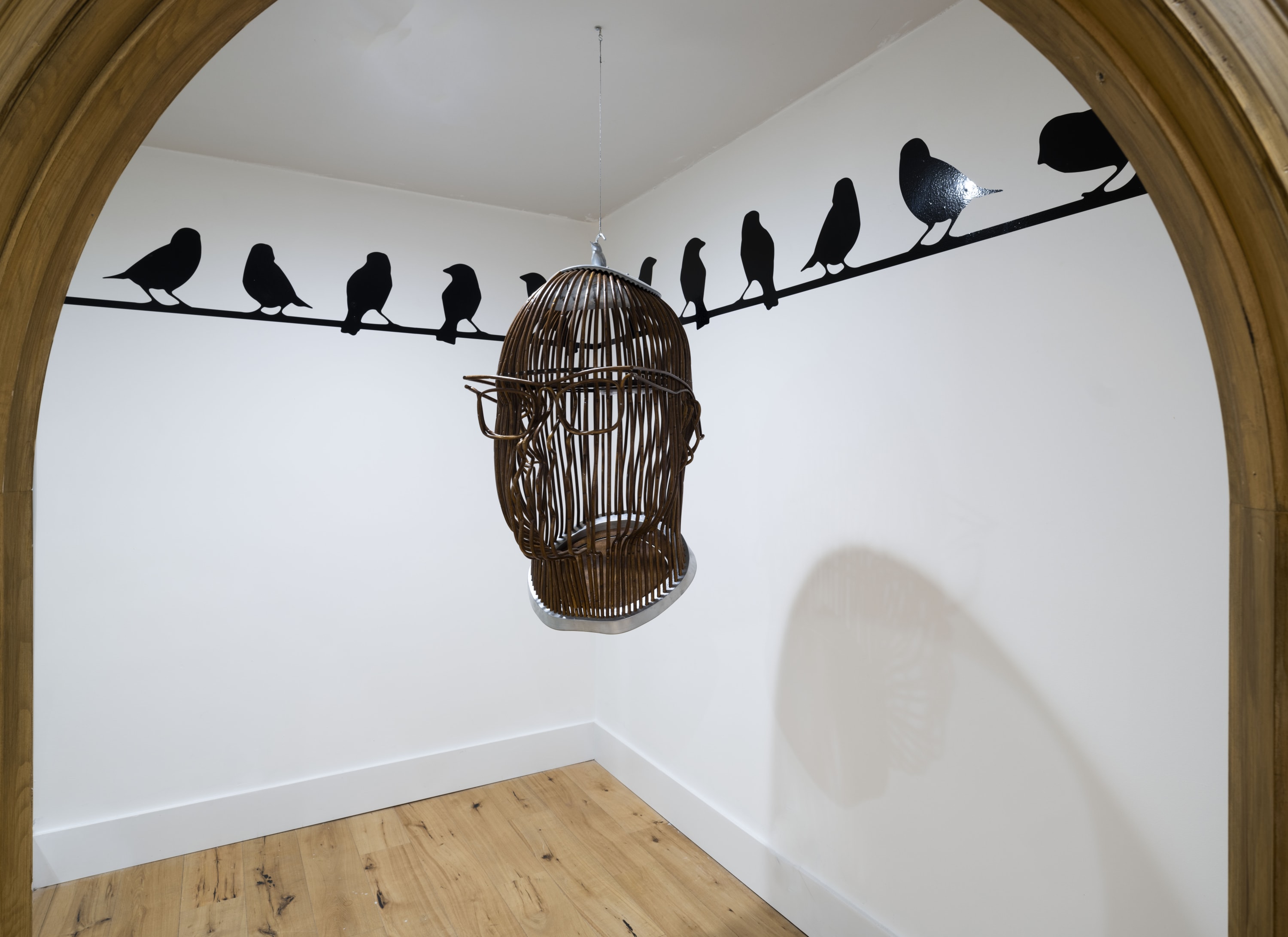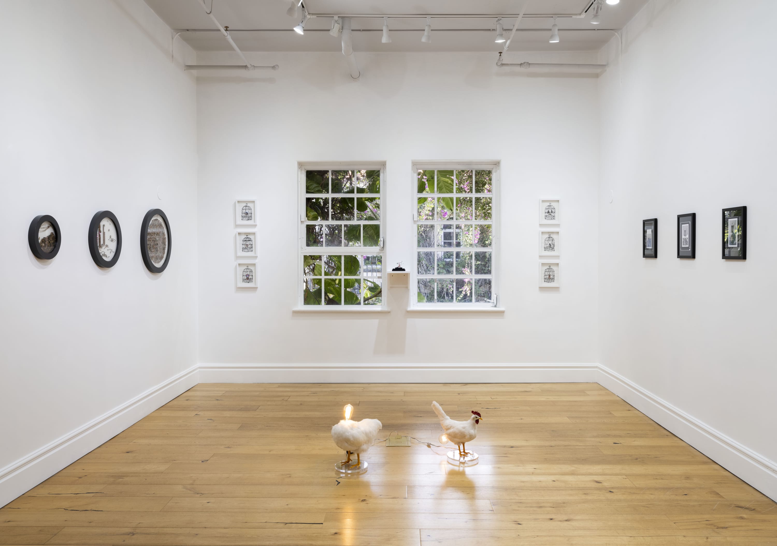 Marta Martino’s mixed media series ASSEMBLAGE22 uses 1965 Rollei camera film from fashion and art projects to create work that “encompasses violent and liberating acts, including the rejection of what is known as a whole by reassembling a temporary reconciliation and gaining a new reality.” Todd Pavlisko's work examines the endless cycle of mental hovering over one’s deep desires and obsessions in a traumatic manner - which relates to the confinement of “why the caged bird sings.” Jo Shane's conceptual work Escape Mechanisms (2017) captures the sensation of the flightless search for freedom from the restrictive cage, whether bird or human, one can be held in. Hunt Slonem's Queen of Bavaria (1989) is a colorful celebration of the diversity of bird species that contrasts Samuel Richardson's paintings which act as a vantage point into the complexity of isolation from the flock. Stacey Lee Webber’s brass currency sculptures use everyday objects to create intricate scenes of birds in everyday life, and David Yepez's Raven Chair (2019) explores the mythological and symbolic significance of Edgar Allen Poe’s The Raven and Yepez's obsession with recreating the fantastic visions of the poet’s abode.